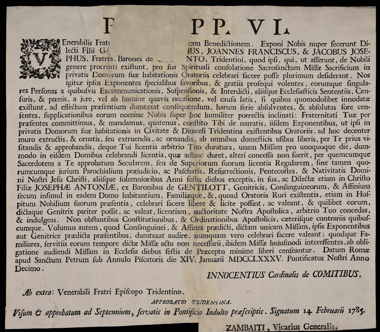 Proclama di papa Pio VI che concede alla famiglia baronale trentina dei Gentilotti e sua discendenza di celebrare la messa nei propri oratori privati, emanato il 14 febbraio 1785, sottoscritto da Innocenzo (Cardinale) e Simone Zambaiti (vicario generale).