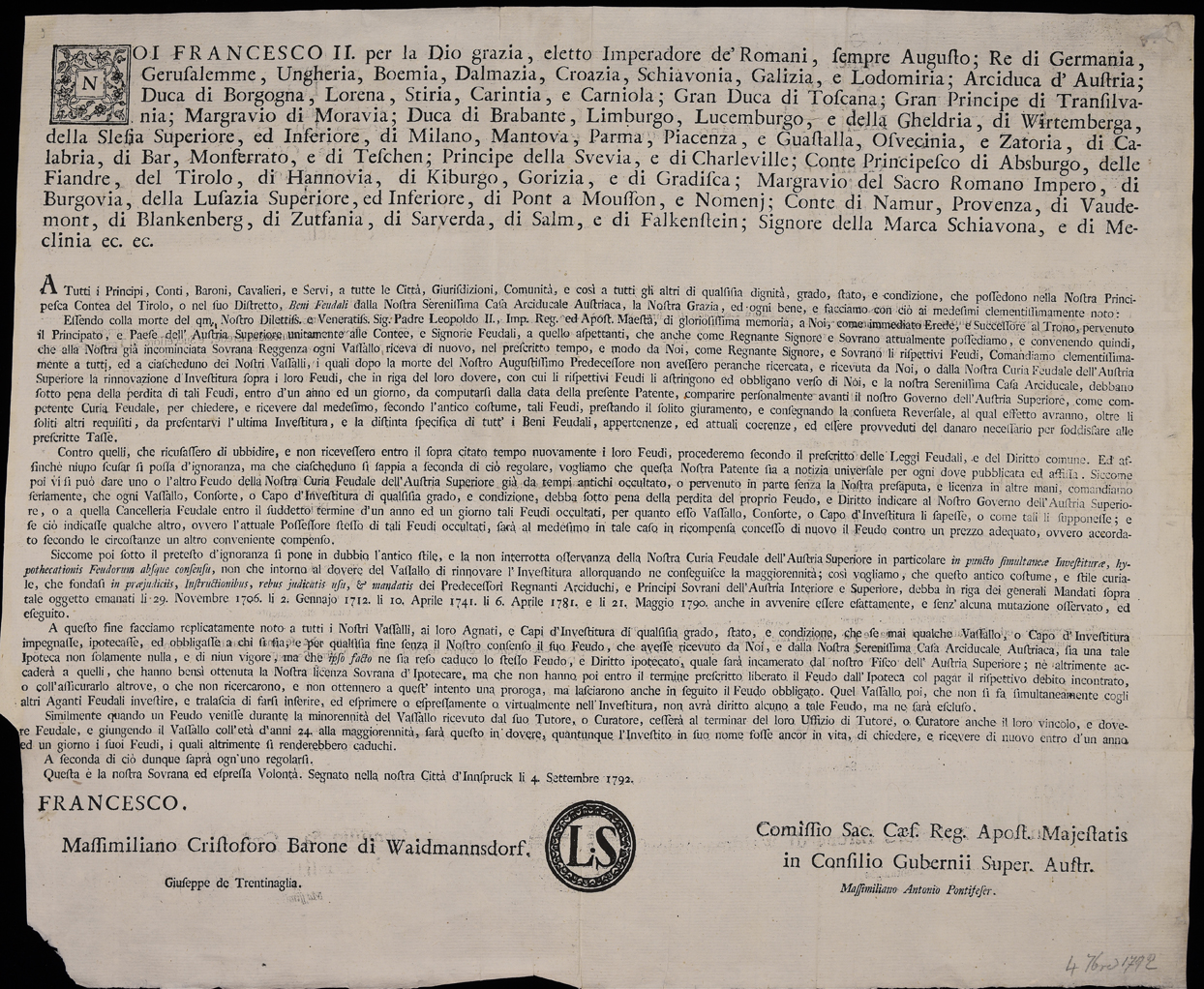 Proclama di Francesco II sul rinnovo delle investiture, emanato il 4 settembre 1792, sottoscritto da Massimilian Cristoph Waidmannsdorf, Giuseppe Trentinaglia, Maximilian Anton Pontifeser.