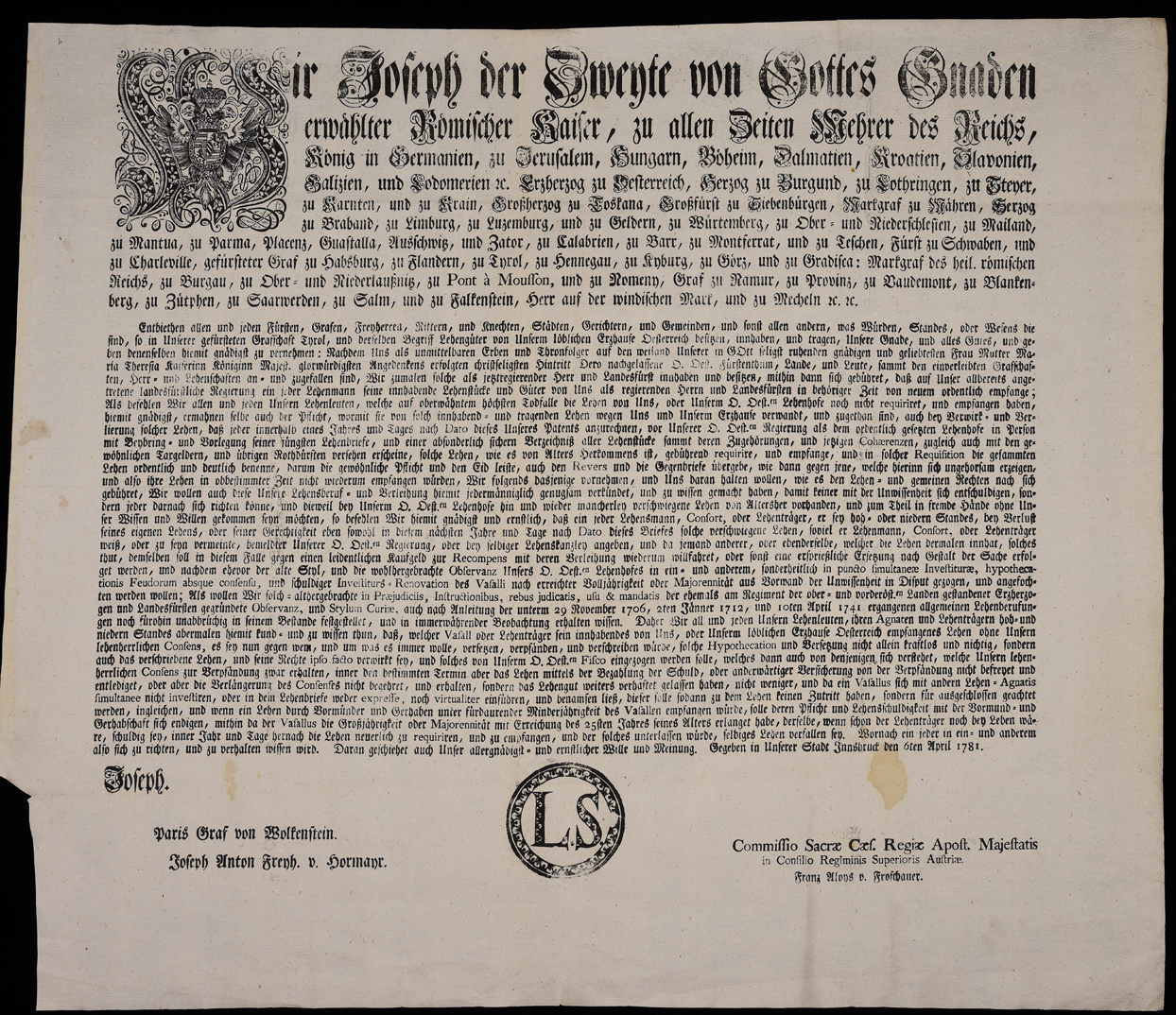 | Wir Joseph der Zweyte von Gottes Gnaden erwählter römischer Kaiser, zu allen Zeiten Mehrer des Reichs, König in Germanien, zu Jerusalem, Hungarn, Böheim, Dalmatien, Kroatien, Slavonien, Galizien, und Lodomerien etc. Erzherzog zu Oesterreich, Herzog zu Burgund … |