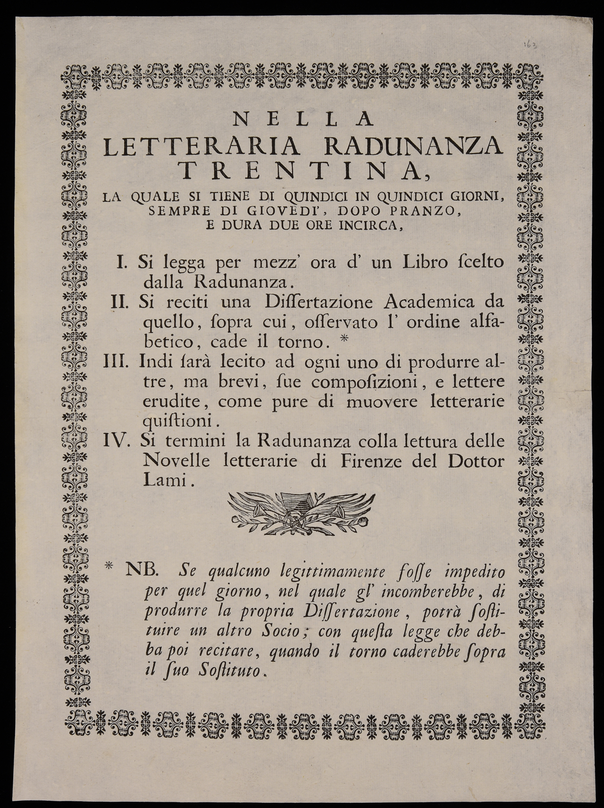 1 manifesto, atl., carattere romano e corsivo, xilografia, testo in cornice tipografica. Manifesto di promozione della Radunanza letteraria trentina.