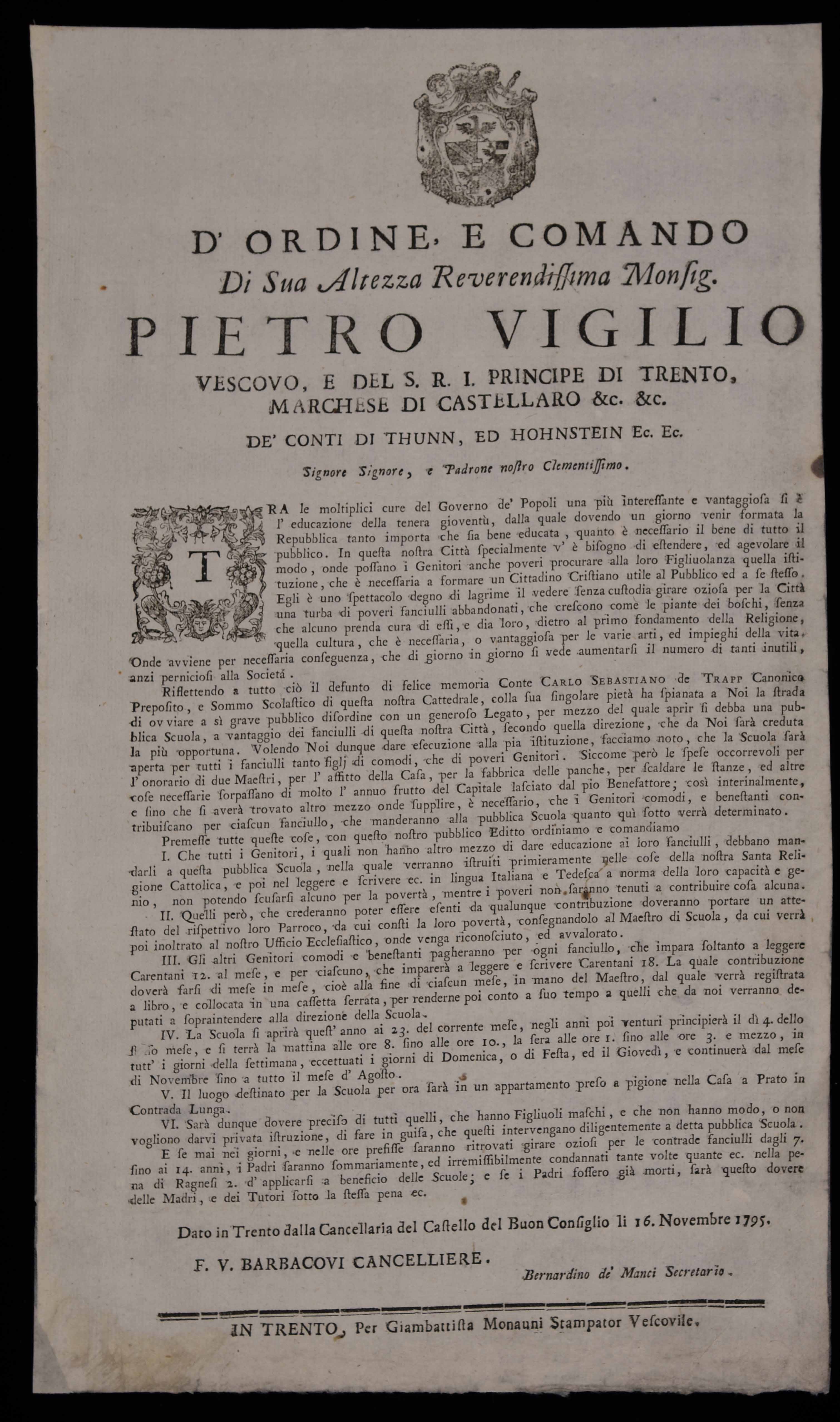 Proclama di Pietro Vigilio Thun, principe-vescovo di Trento, sull'istituzione di una scuola pubblica, emanato il 16 novembre 1795, sottoscritto da Francesco Vigilio Barbacovi e Bernardino Manci.