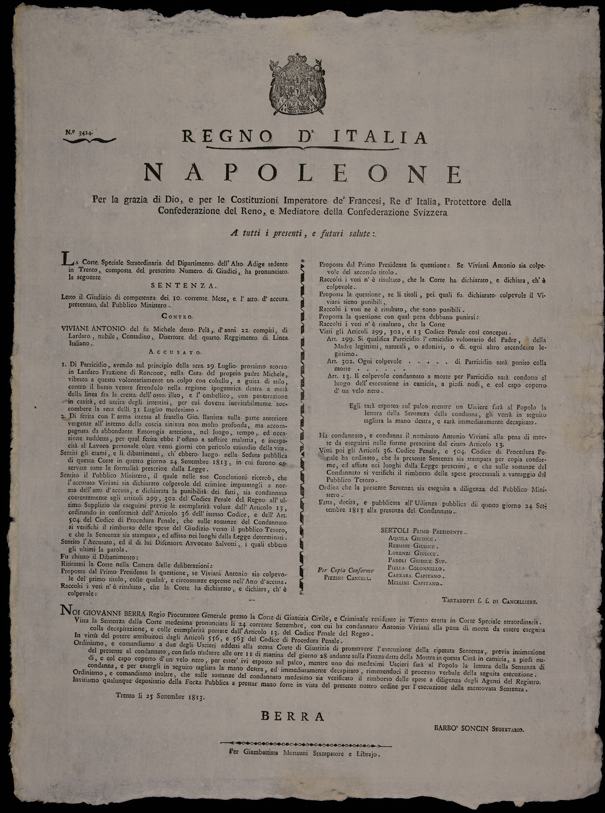 Sentenza della Corte di giustizia civile e criminale dell'Alto Adige di condanna per parricidio di Antonio Viviani, emanata il 25 settembre 1813, sottoscritta da Giovanni Berra e dal segretario Barbò Soncin.