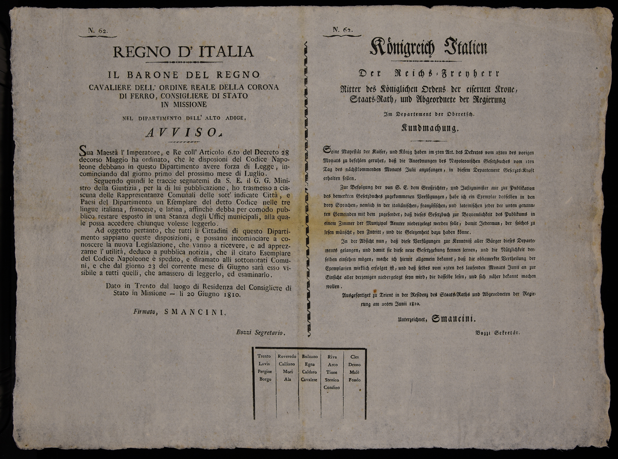 Proclama del Consigliere di Stato in missione Smancini sull'applicazione delle disposizioni del Codice Napoleonico, emanato il 20 giugno 1810, sottoscritto da Smancini e dal segretario Bozzi