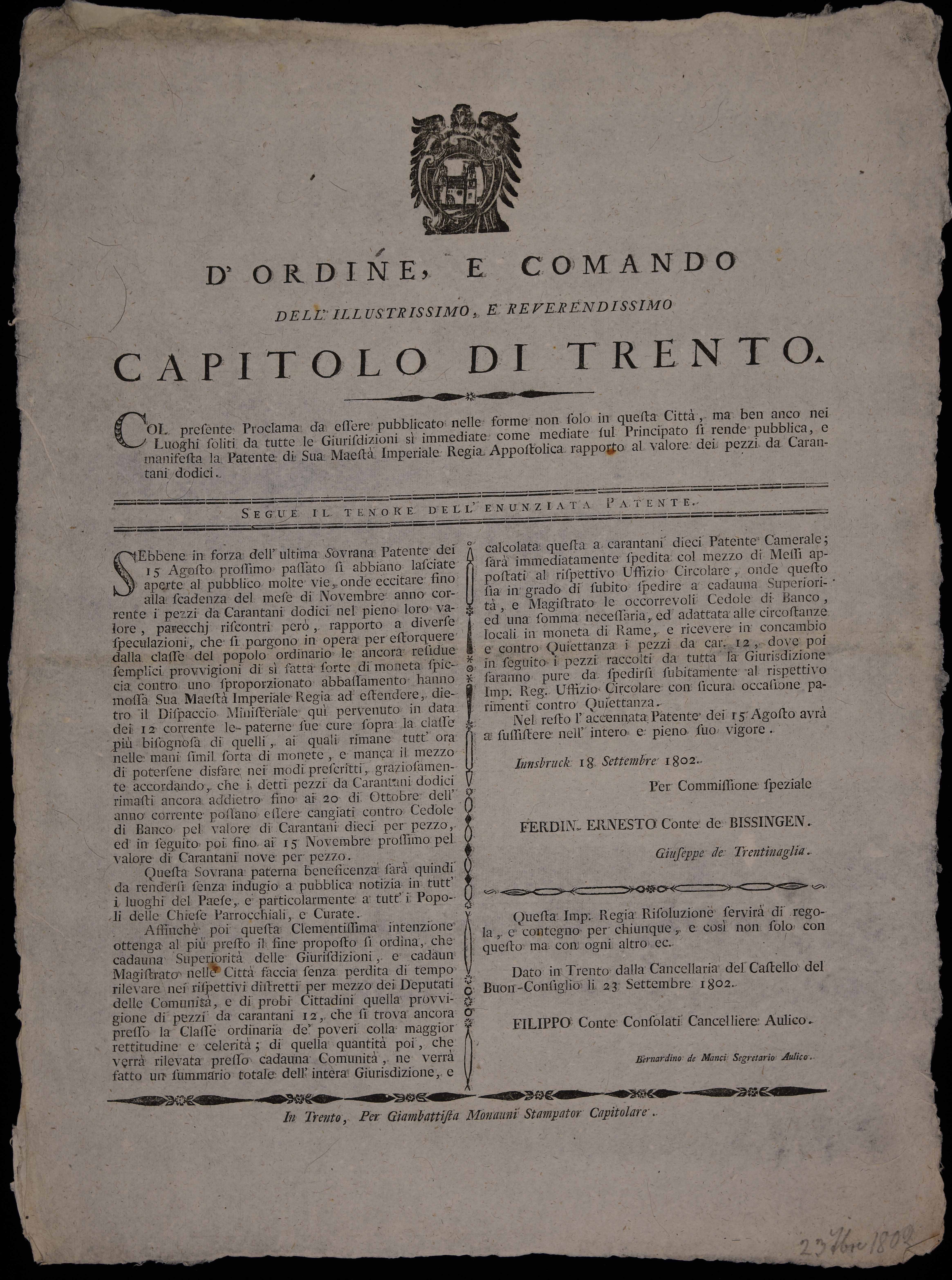 Proclama del Capitolo di Trento sul cambio dei pezzi da carentani dodici (monete di piccolo taglio), emanato il 23 settembre 1802, sottoscritto da Filippo Consolati e Bernardino Manci, ristampa del proclama di Ferdinand Ernest Bissingen emesso ad Innsbruck il 18 settembre 1802, sottoscritto da Ferdinand Ernest Bissingen e Giuseppe Trentinaglia.