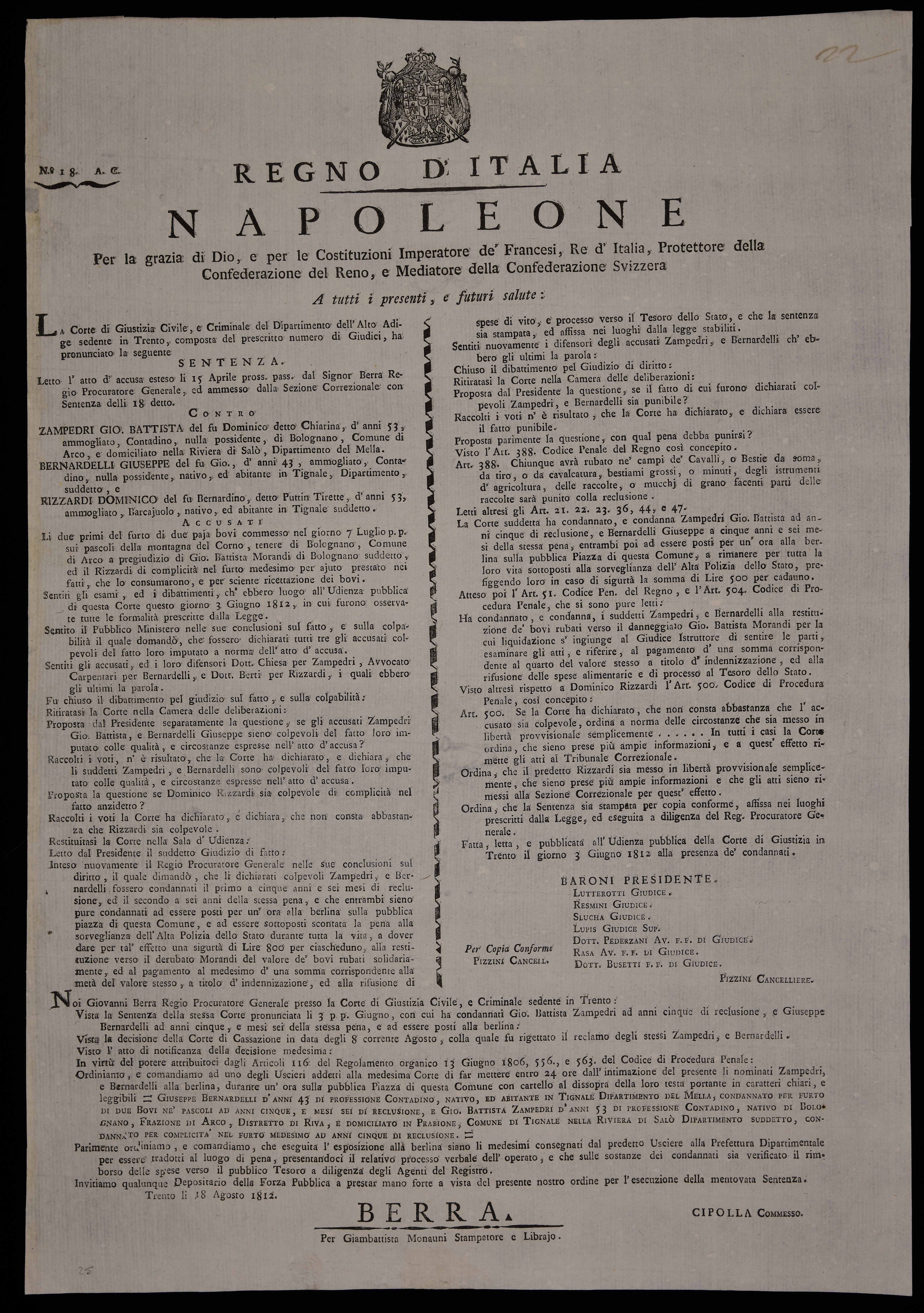 Proclama della Corte di giustizia civile e criminale dell'Alto Adige sulla condanna per furto di Giovanni Battista Zampedri, Giuseppe Bernardelli e Domenico Rizzardi, emanato il 18 agosto 1812, sottoscritto da Giovanni Berra e Cipolla (commesso).